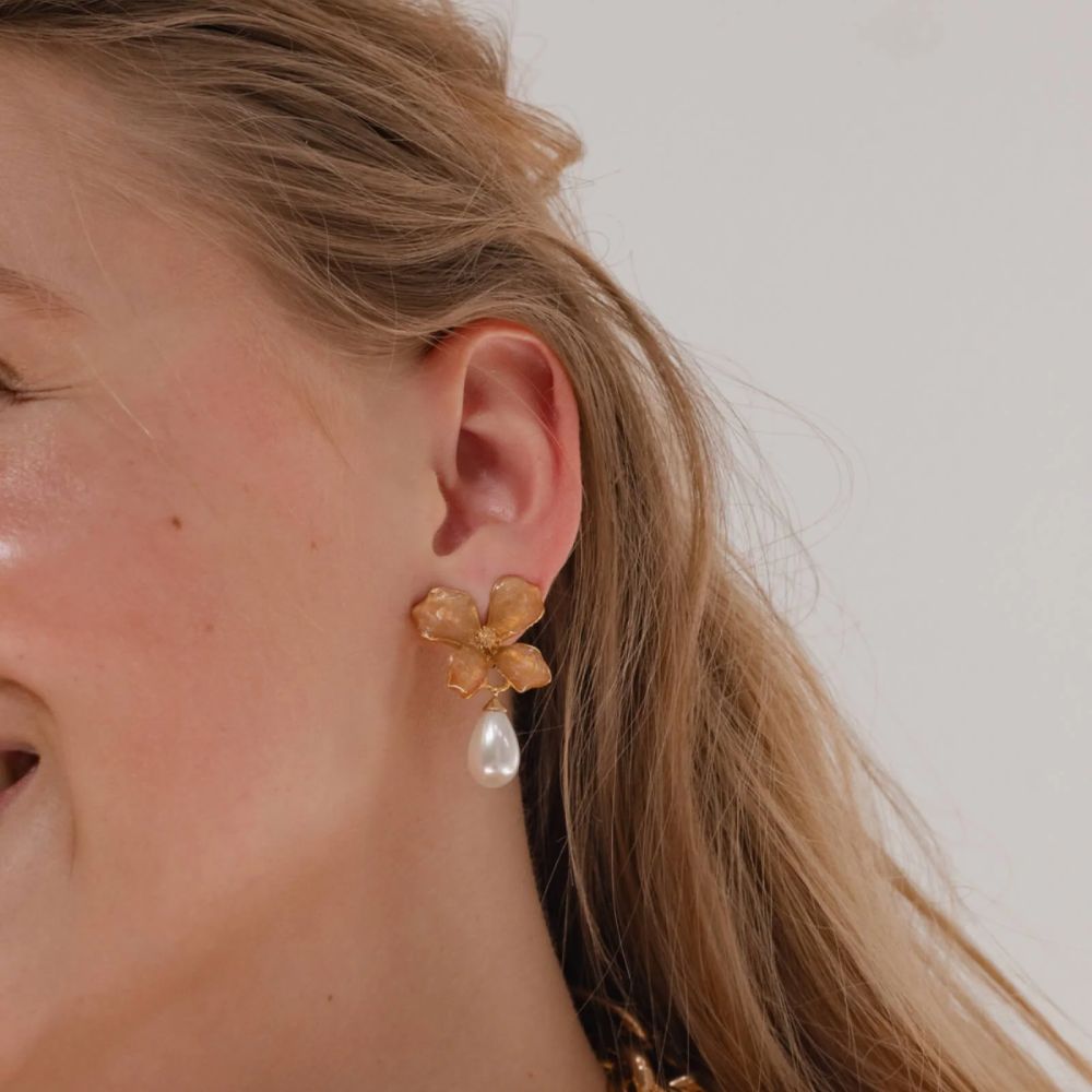 Pendientes de pincho en plata bañada en oro de 18k con flor y perla pera blanca de 7 x 10 mm. Las flores esmaltadas sobre plata bañada en oro de 18k brillan para ocasiones de día y de noche.