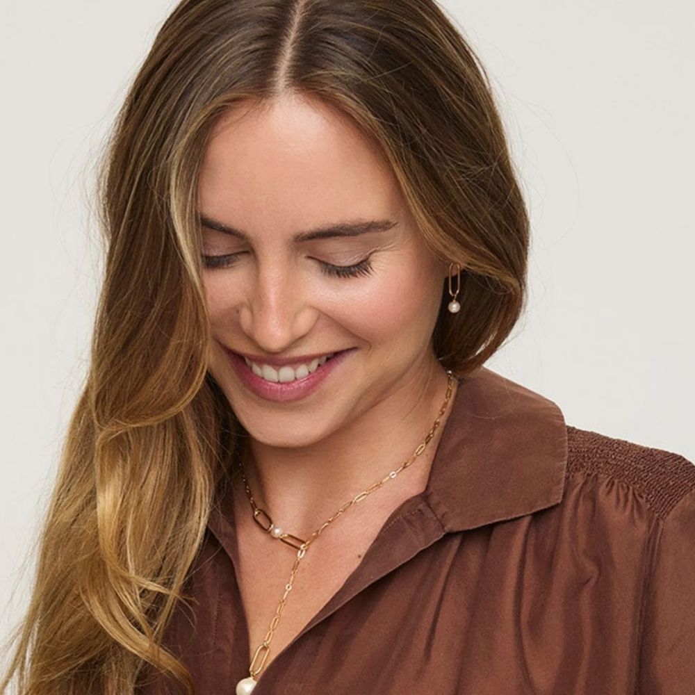 Pendientes de cadena de eslabones de 2,5 cm de largo en plata de ley chapada en oro de 18k. Los pendientes Links presentan un diseño de perla blanca redonda de 6 mm elaborada artesanalmente y un cierre de botón a presión.