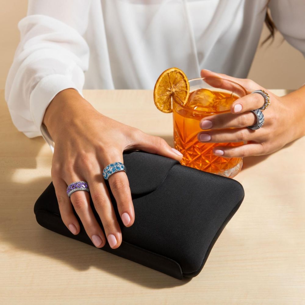 Anillo de plata 925 rodiada con pavé de circonitas blancas y azules. Anillo ajustable con tamaño flexible que se adapta al dedo para un ajuste perfecto.