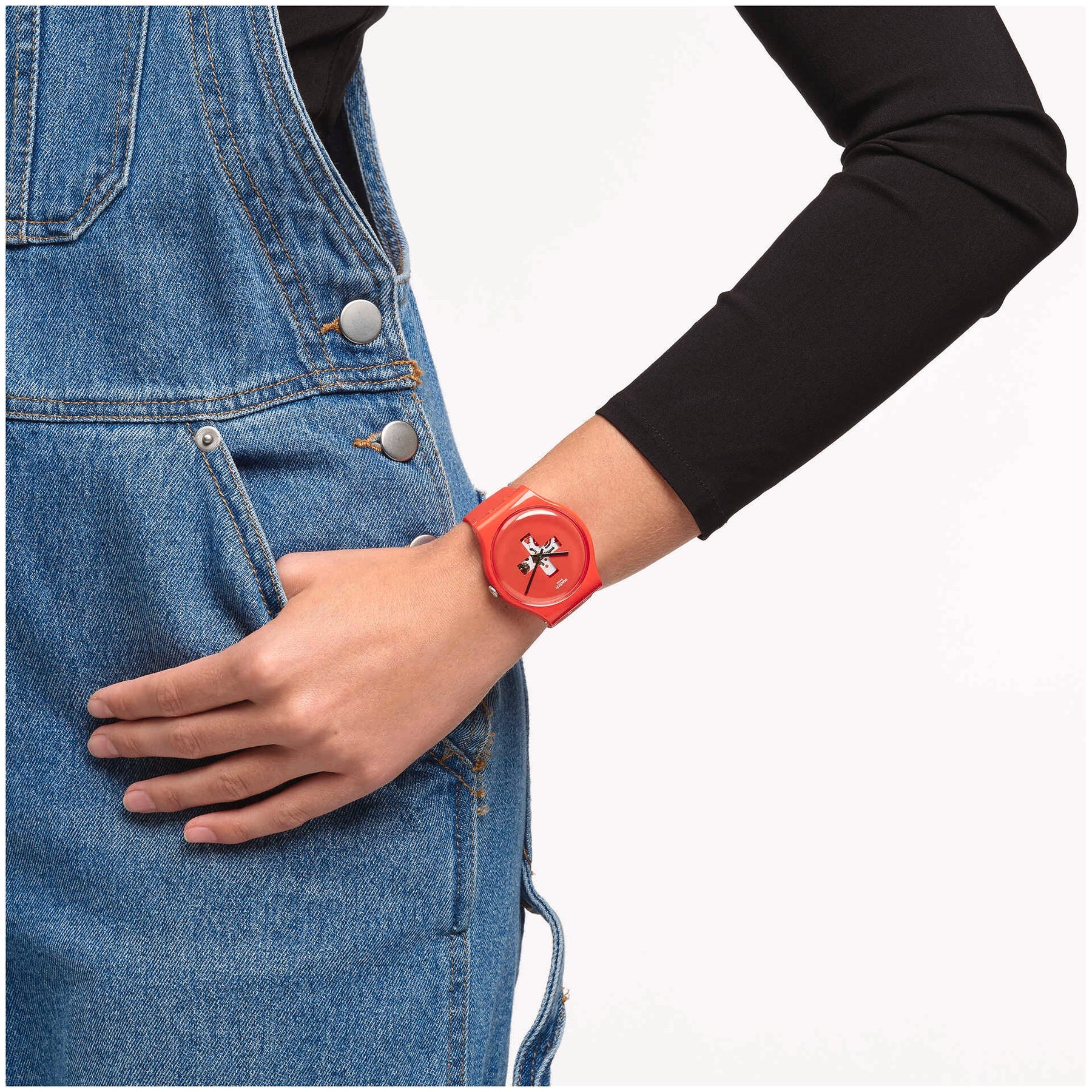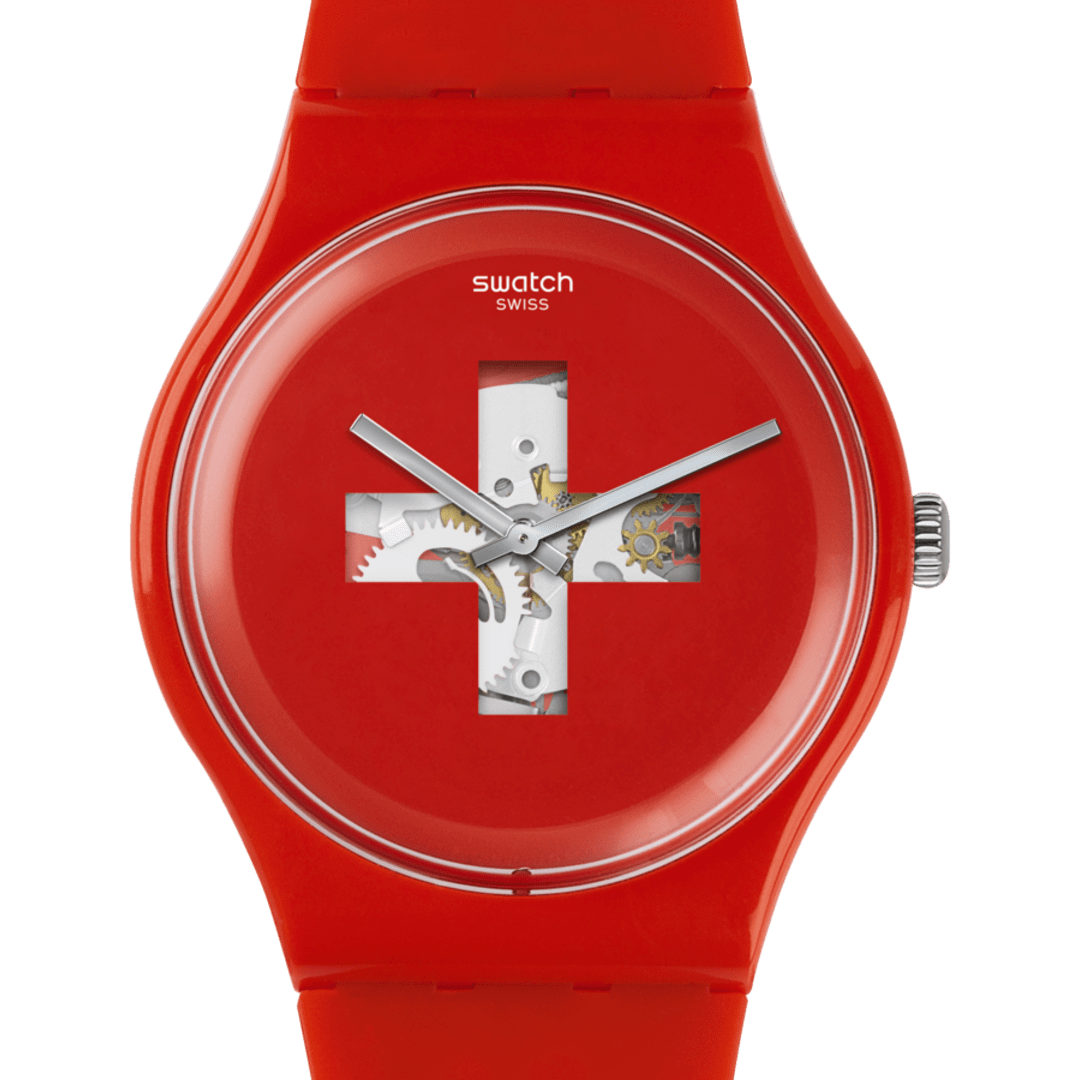 Marca tendencia con el espectacular reloj SWISS AROUND THE CLOCK (SUOR106). Este modelo presenta una cruz transparente sobre el fondo de una esfera roja. Cuenta con una reluciente caja roja y una correa a juego para un auténtico aspecto que no pasa desapercibido.