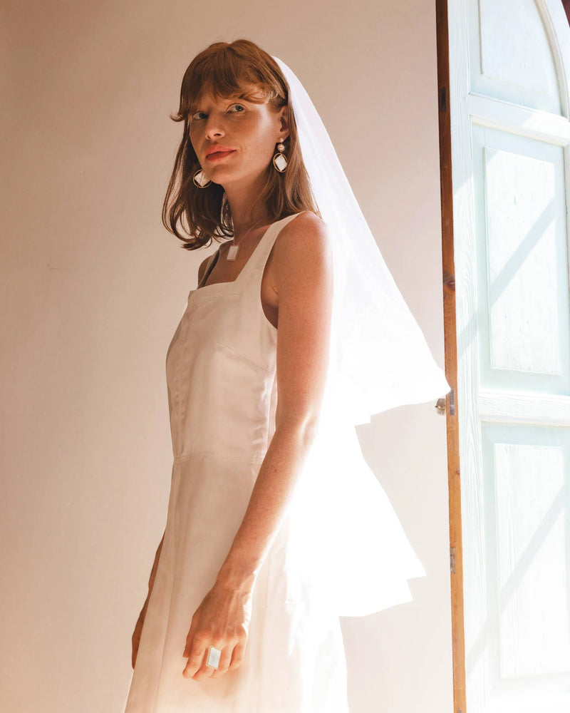 Los pendientes largos estilizan el rostro con su sutil movimiento, el colgante realza el escote con su resplandor nacarado y el anillo añade el toque final de refinamiento.