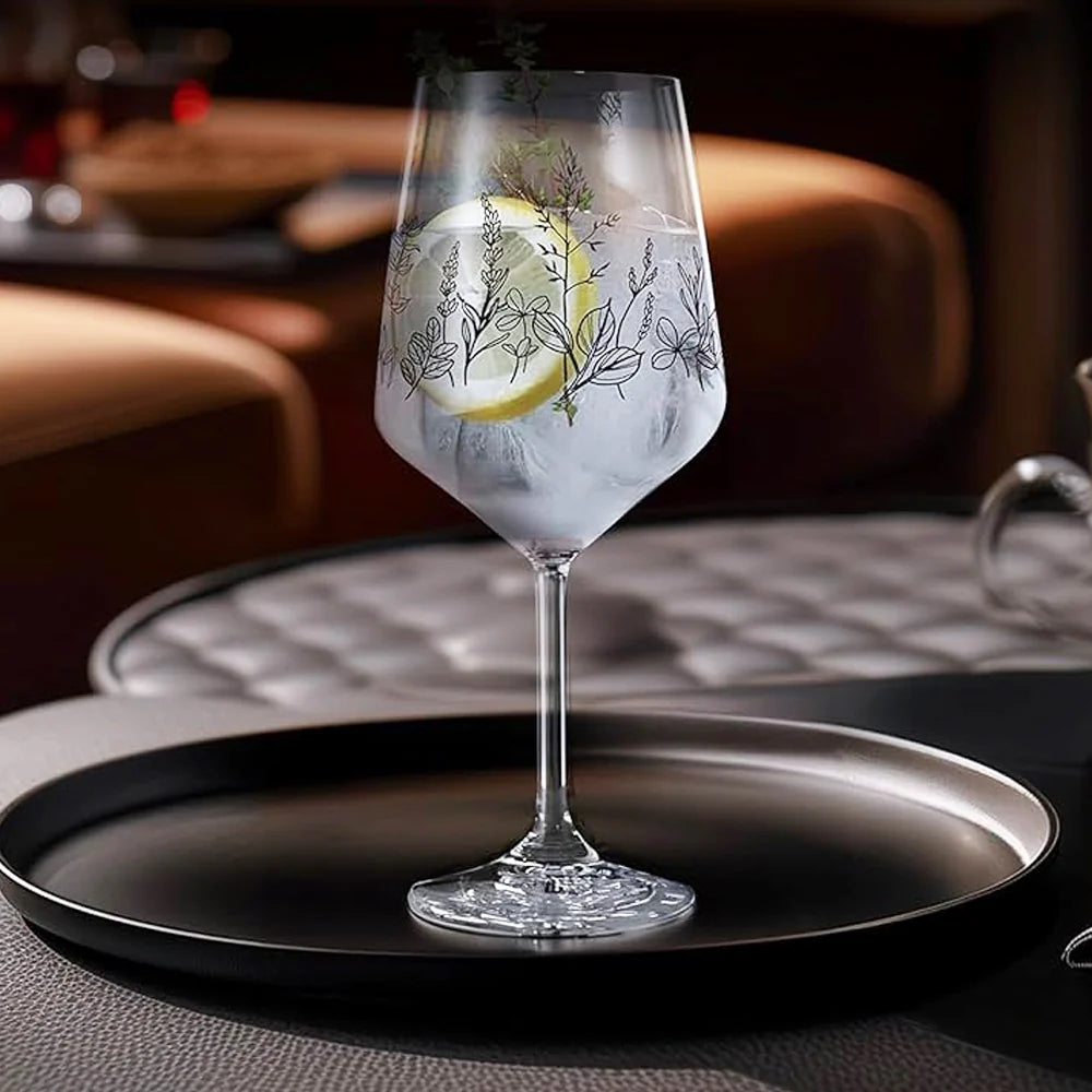 Las copas de cristal de la colección Tattoo Botanical de Nachtmann presentan una gran cantidad de hierbas, especias y flores grabadas como adornos. Estos elementos florales de estilo tatuaje se destacan como un contraste para el contenido de la copa.