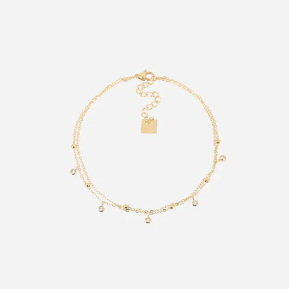 Cadena de tobillo de doble hilera en acero chapado en oro, con una de las dos cadenas adornada con borlas de colores.